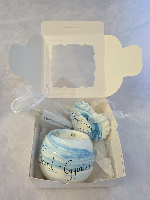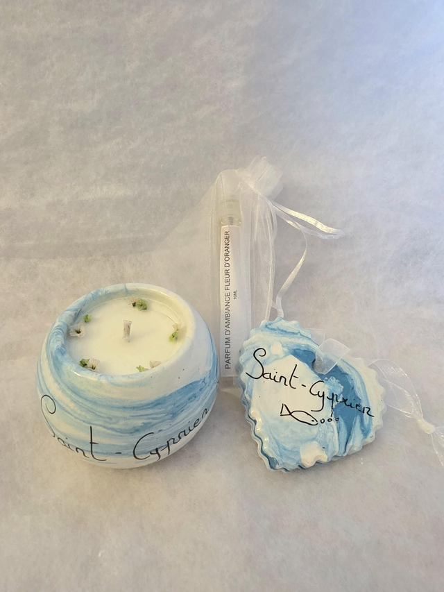 Coffret comprenant une bougie Saint-Cyprien, un parfum d'ambiance et une suspension cœur Saint-Cyprien à parfumer.