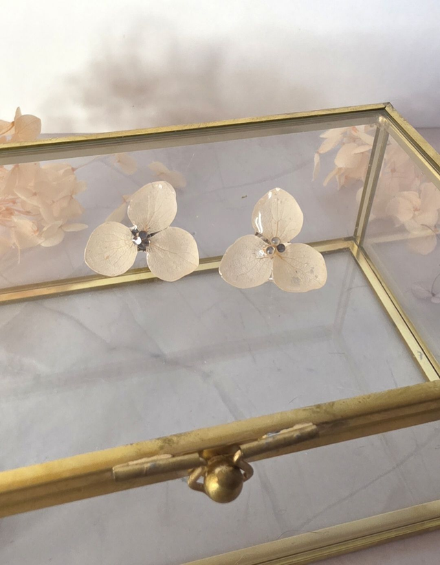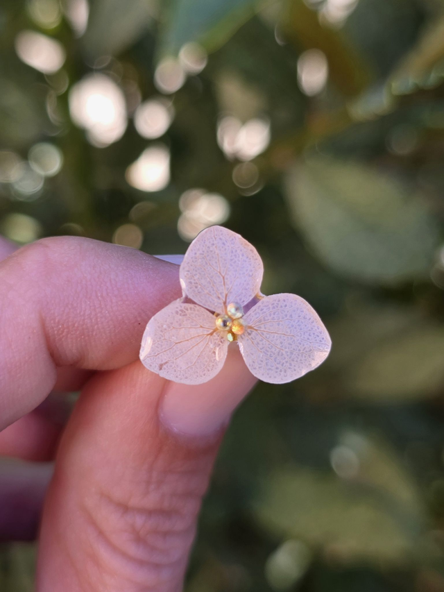 Véritables pétales d’hortensia séchés, délicatement enrobés de résine transparente pour préserver leur beauté naturelle.