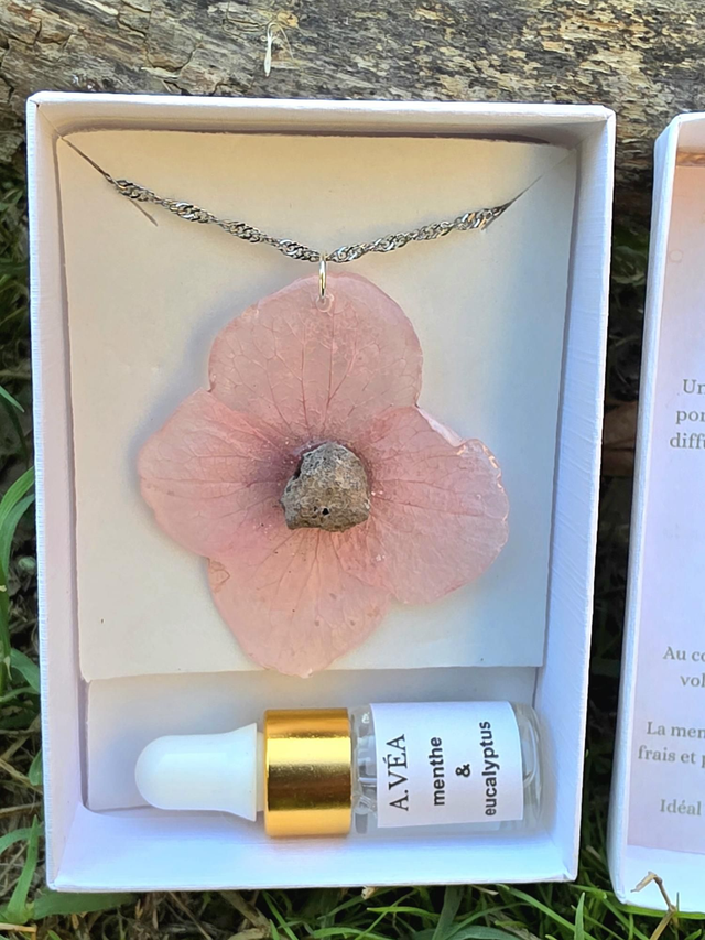 Sublimez votre style avec Aura, un collier délicat associant une fleur d’hortensia séchée à une pierre de lave naturelle. Déposez une goutte du parfum ou huile essentielle préférée, pour une touche sensorielle unique.