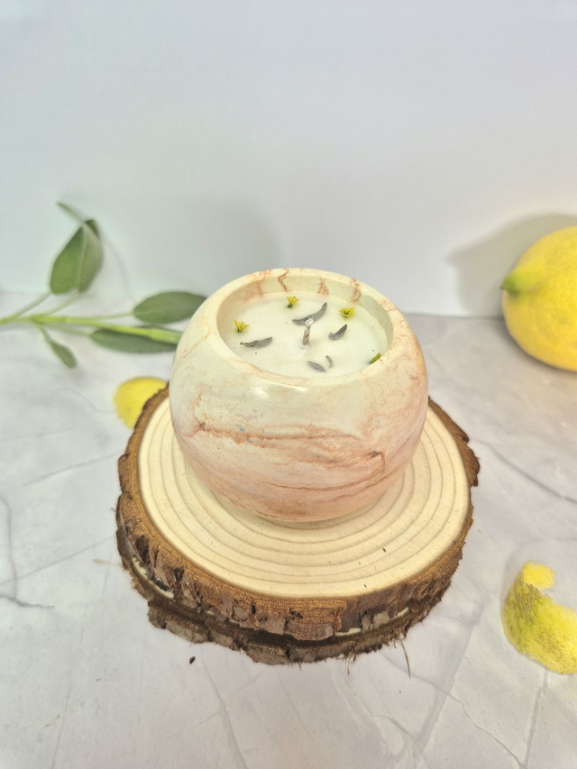 Composition : 90% cire de soja 10% parfum agrumes et sauge de Grasse, mèche en coton bio tressé.