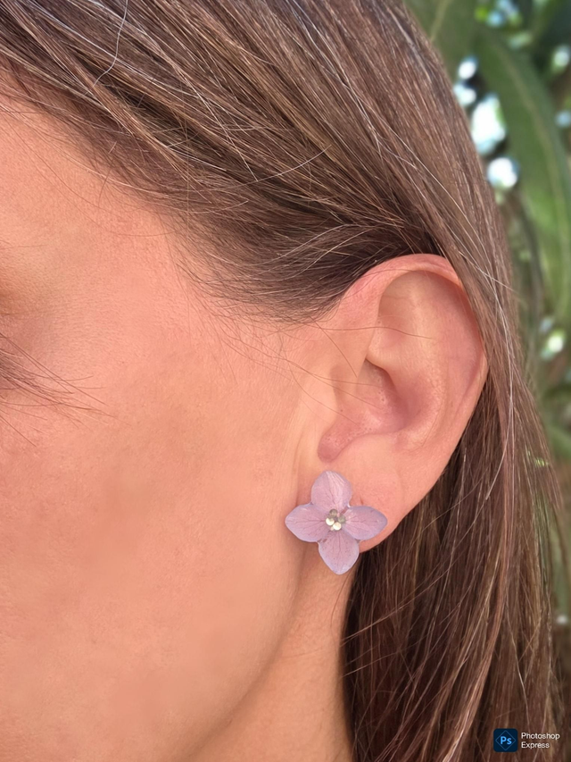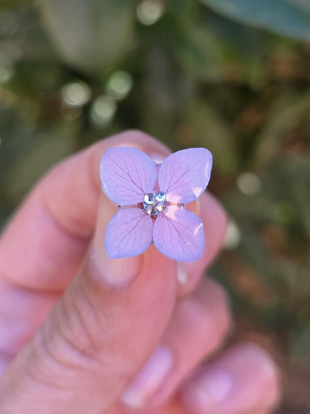Véritables pétales d’hortensia séchés, délicatement enrobés de résine transparente pour préserver leur beauté naturelle.